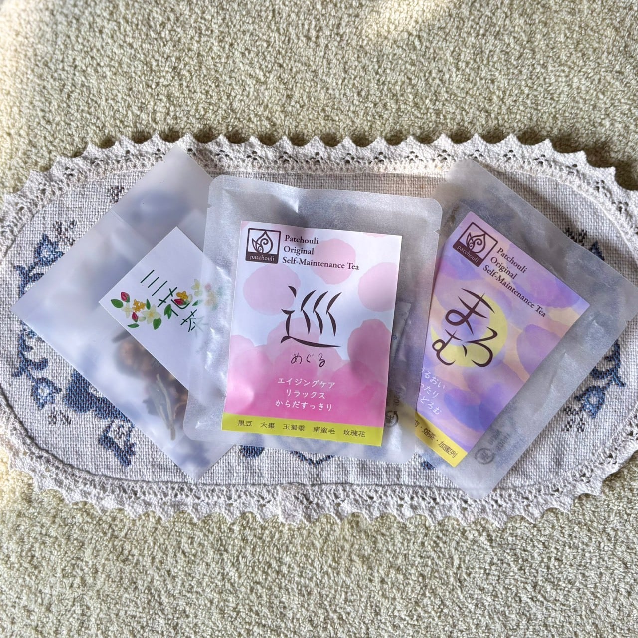 町田のパチュリさんオリジナル養生茶3種のティーパック付きの商品となります。